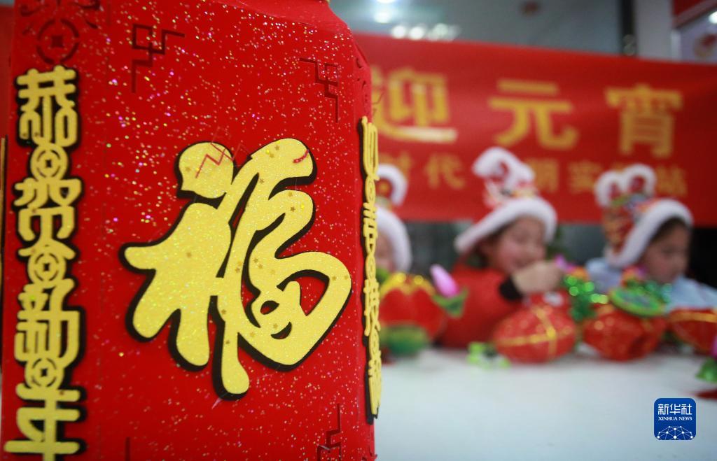 2月14日,在江苏省扬州市邗江区竹西街道安平社区,小朋友们在制作花灯。