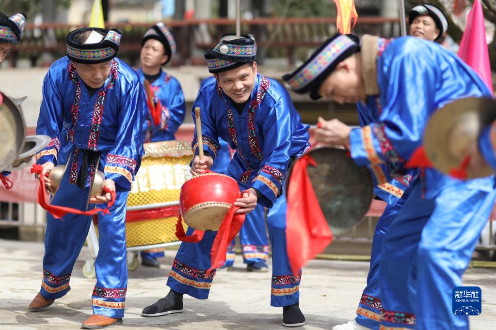 2月14日,民间艺人在贵州省黔东南苗族侗族自治州岑巩县羊桥土家族乡杨柳村表演“土家战鼓”。