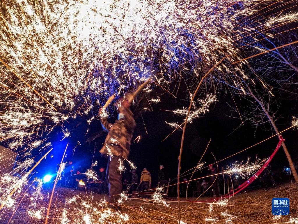 2月14日,山东省邹城市大束镇北葛村村民聚集在村口,用打铁花的形式喜迎元宵节。