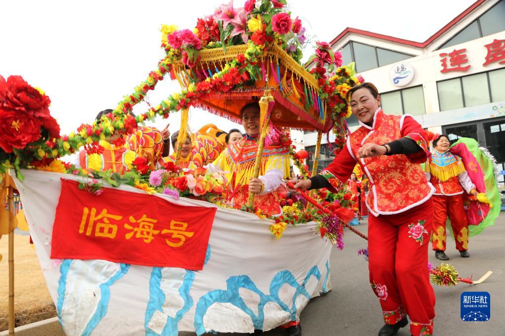 2月15日,民间艺人在江苏省连云港市连云区连岛渔村表演“划旱船”。