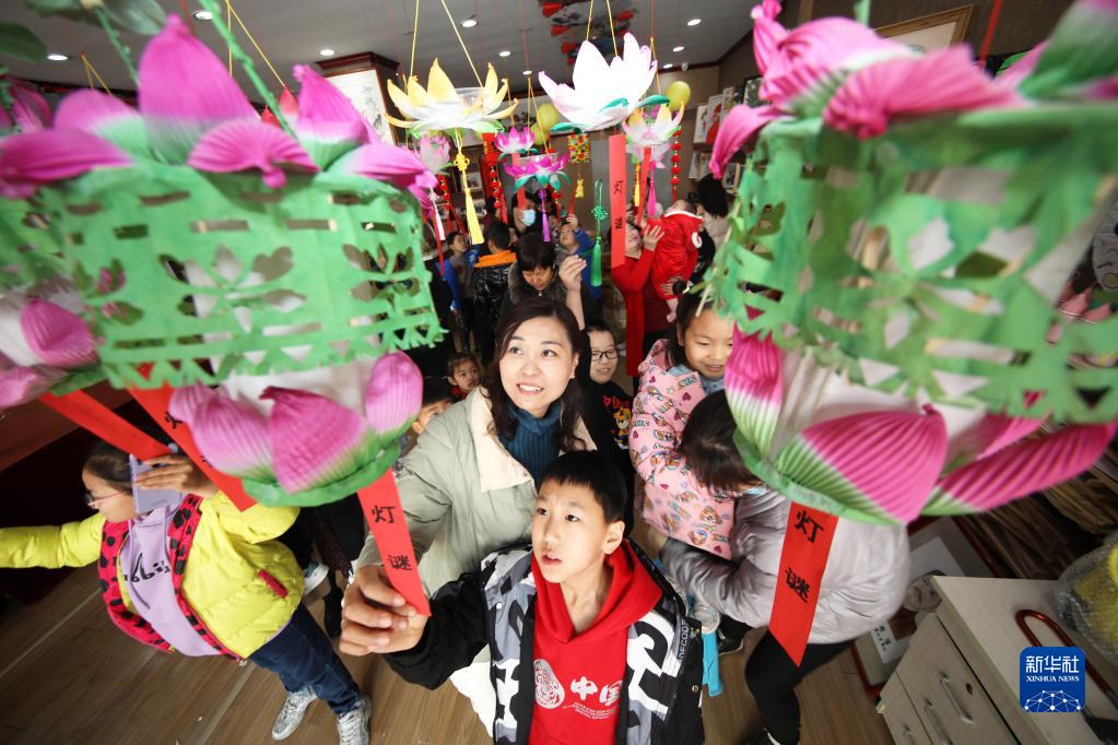 2月15日,在山东省滨州市无棣县,家长和孩子们在“猜灯谜庆元宵”活动中猜灯谜。