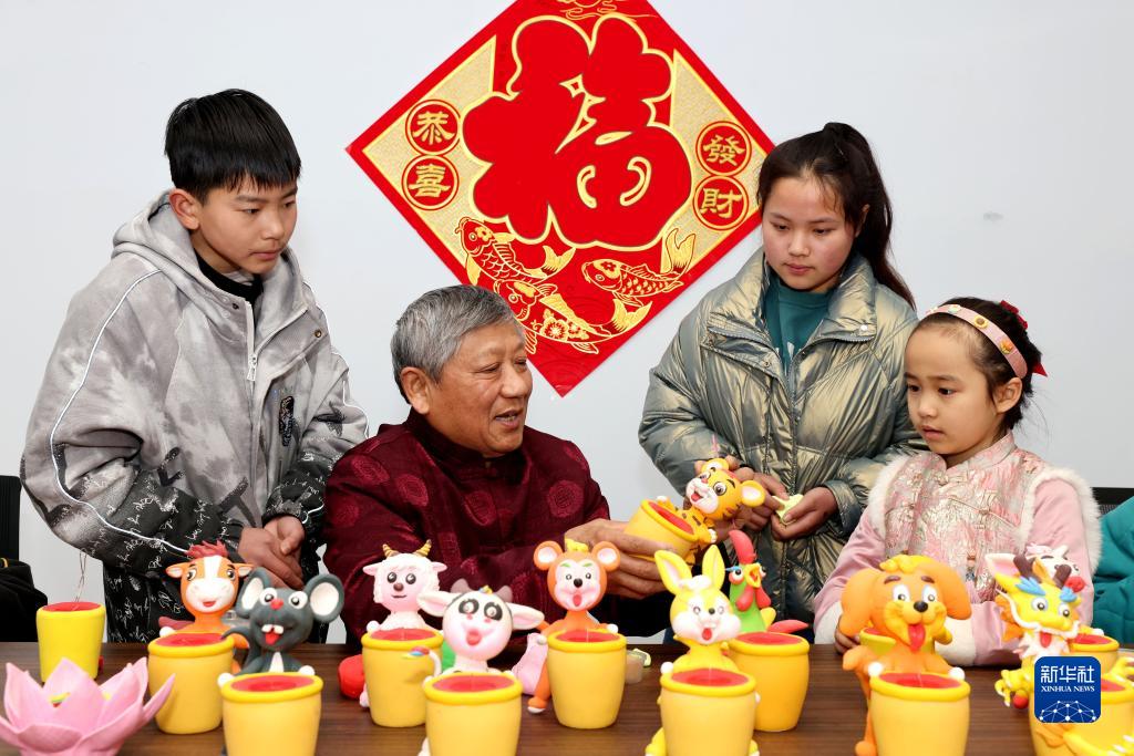 2月15日,在山东省枣庄市孟庄镇大郭庄村,民间艺人阚宗勤(左二)向孩子们传授“十二生肖面灯”的制作技艺,让孩子们感受传统文化的魅力。