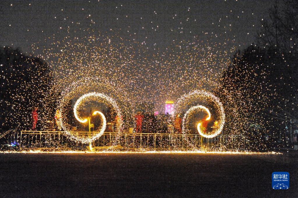2月14日,在河南省洛阳市洛龙区隋唐城遗址植物园,民俗艺人为市民、游客表演“打铁花”,喜迎元宵佳节。