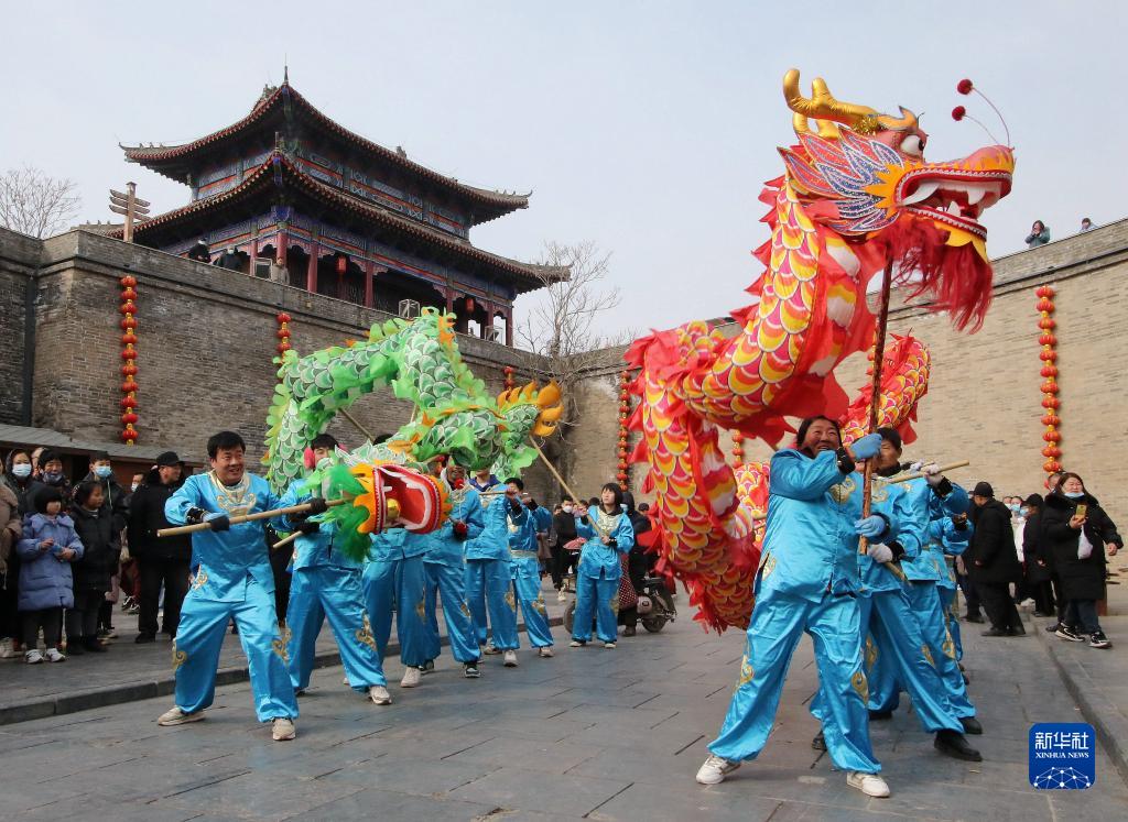 2月15日,民间艺人在河北省邯郸市永年区广府古城表演舞龙。