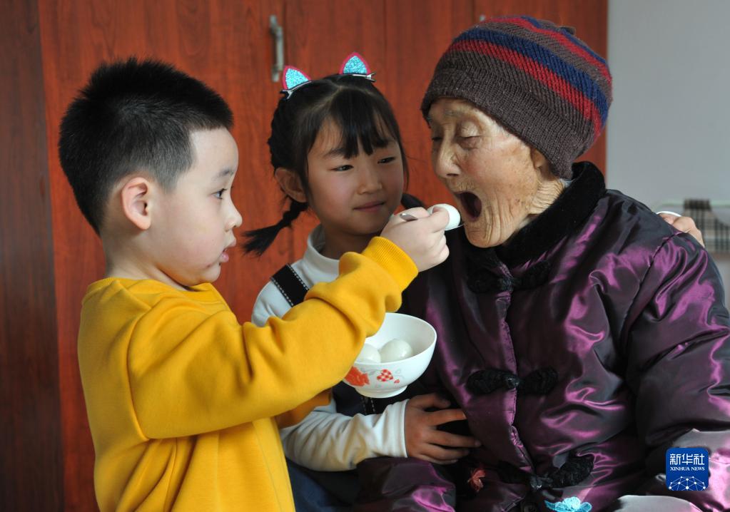 2月15日,河北省石家庄市藁城区系井村五世同堂的百岁老人周香荣品尝玄孙递上的元宵。