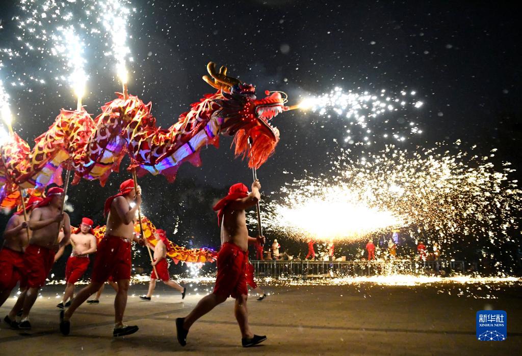 2月14日,在河南省洛阳市洛龙区隋唐城遗址植物园,民俗艺人为市民、游客表演舞龙和“打铁花”,喜迎元宵佳节。