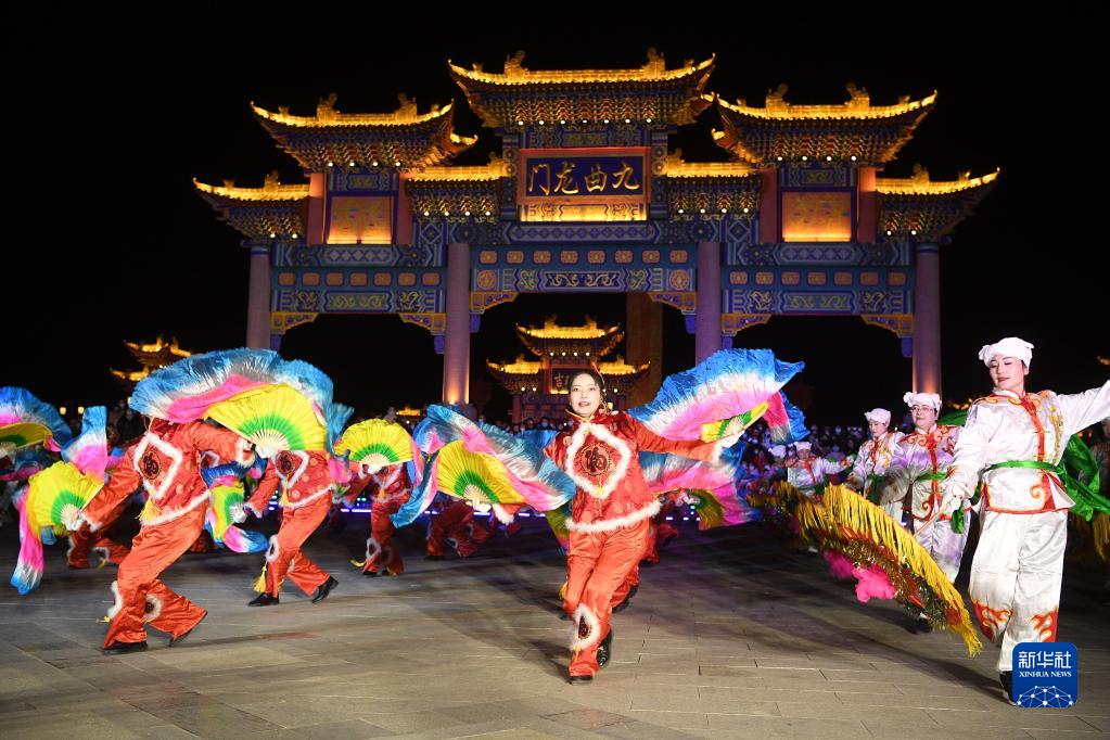 2月14日,演员在进行秧歌表演。元宵节期间,宁夏盐池县开展龙门祈福游九曲系列元宵节民俗文化活动,吸引众多百姓前来参观体验。