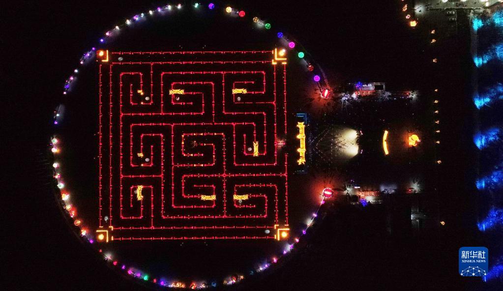 2月14日拍摄的宁夏盐池县黄河九曲龙门灯阵(无人机照片)。元宵节期间,宁夏盐池县开展龙门祈福游九曲系列元宵节民俗文化活动,吸引众多百姓前来参观体验。