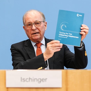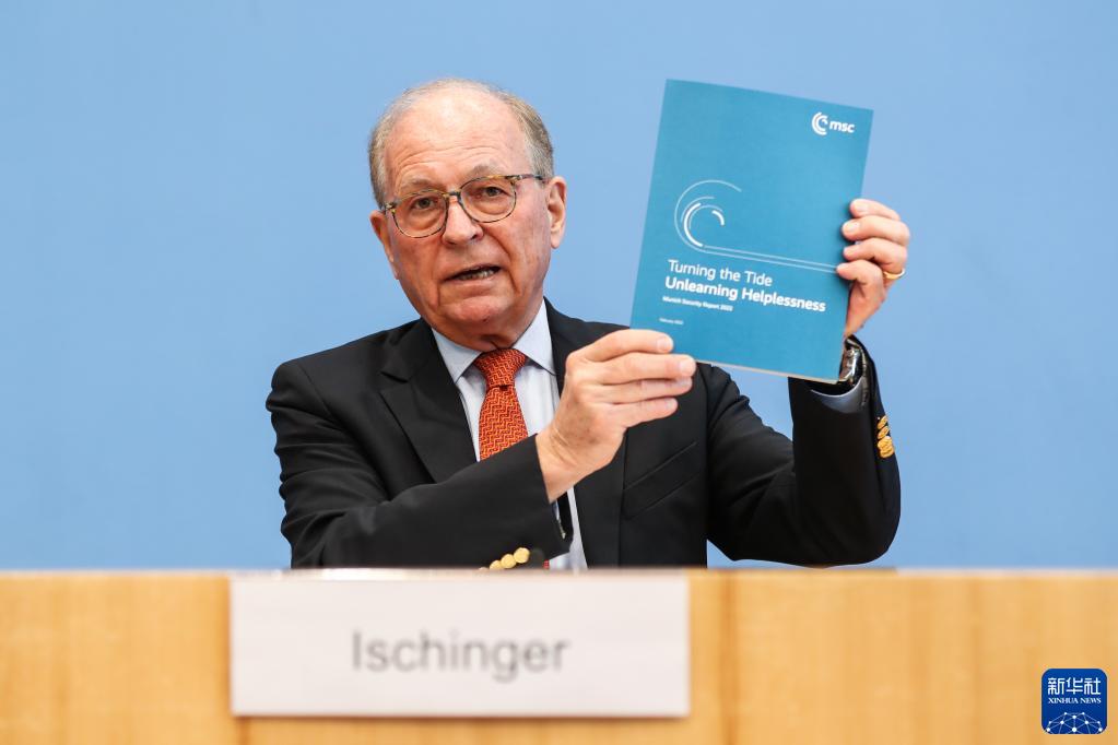 2月14日,在德国首都柏林,慕尼黑安全会议主席沃尔夫冈·伊申格尔在新闻发布会上展示年度安全报告。