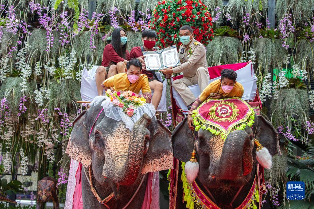 当日,泰国芭提雅东芭乐园为9对新人举行了一场别开生面的“象背婚礼”,祝福他们有情人终成眷属。