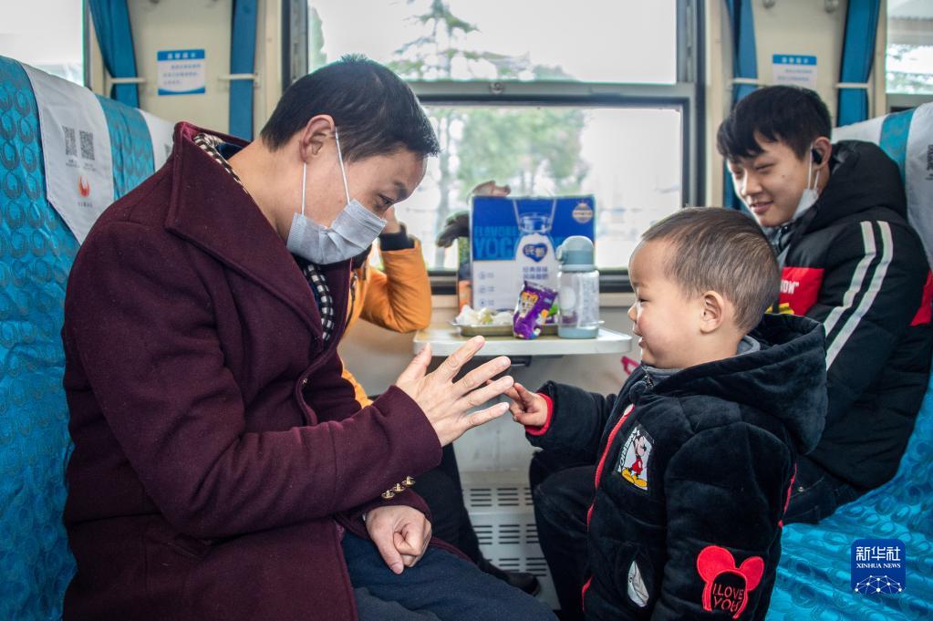 2月15日,在6025次列车上,乘客饶武林和小儿子做游戏。