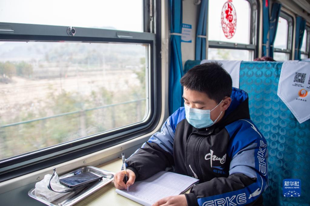 2月15日,乘客杨子健在6026次列车上练习书法。