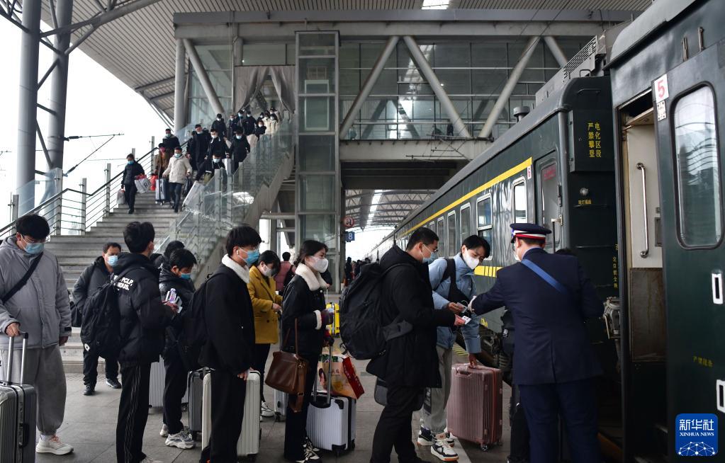 2月16日,旅客在安徽阜阳火车站检票上车。