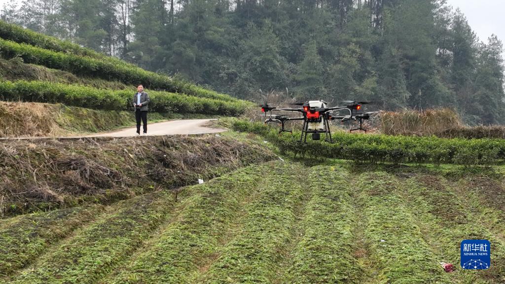 2月16日,贵州省凤冈县土溪镇农民操作无人机开展喷防作业(无人机照片)。