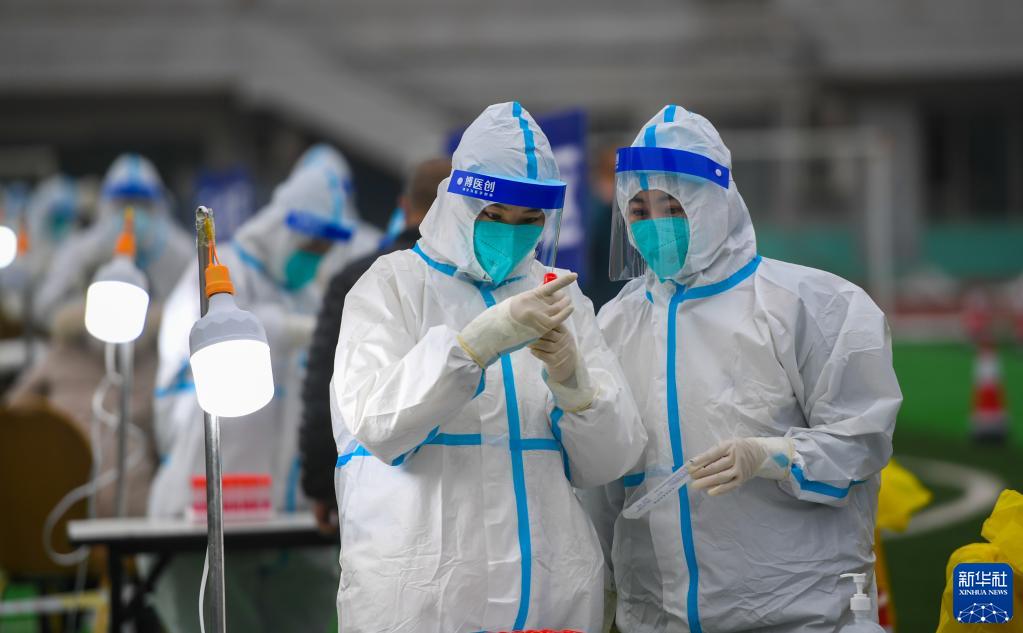 2月17日,在呼和浩特市人民体育场临时核酸检测点,工作人员包装采样试管。新华社记者 彭源 摄