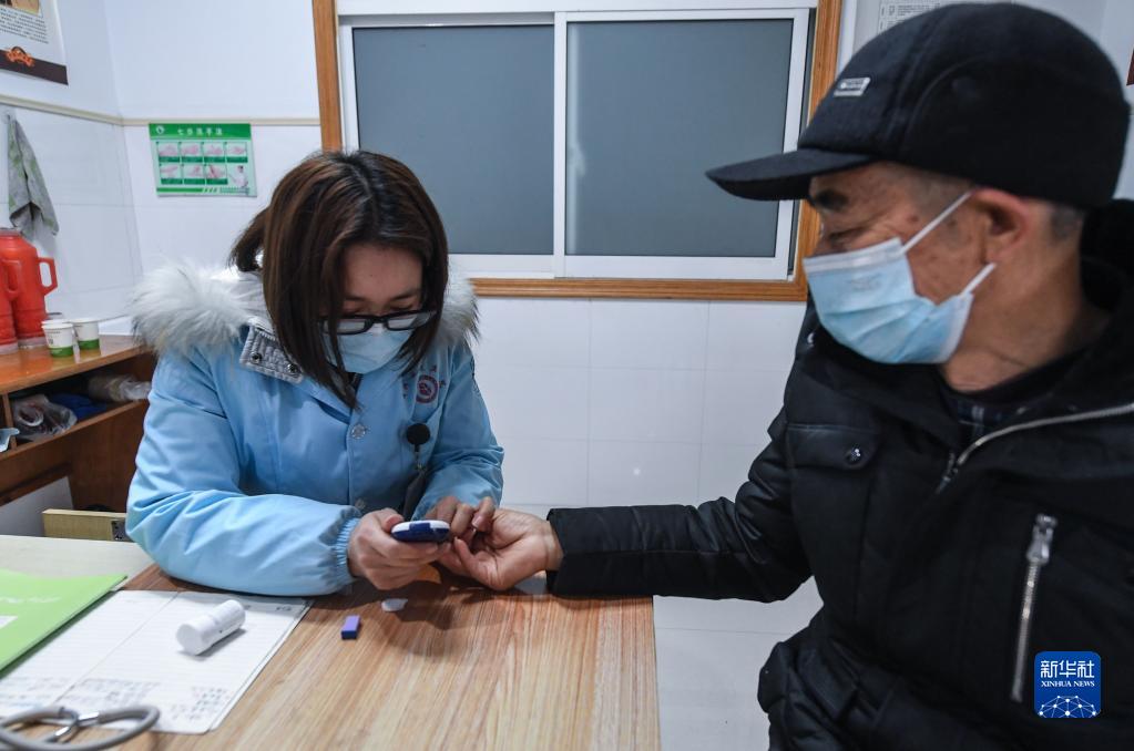 2月18日,湖州市第一人民医院医疗保健集团埭溪院区的家庭医生给患有糖尿病的村民测量血糖。
