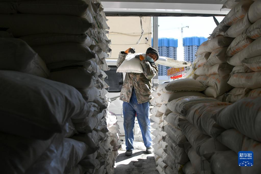 2月18日,商户在呼和浩特市美通农产品批发市场内搬运面粉。