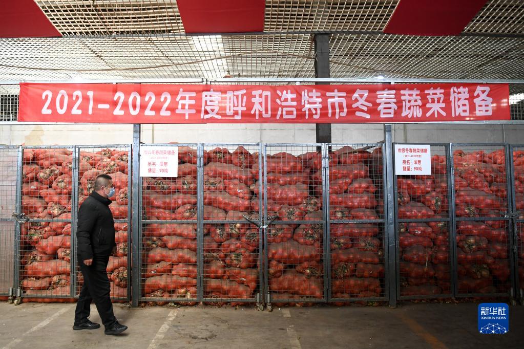 2月18日,市场工作人员在检查储存于呼和浩特市美通农产品批发市场内的洋葱。
