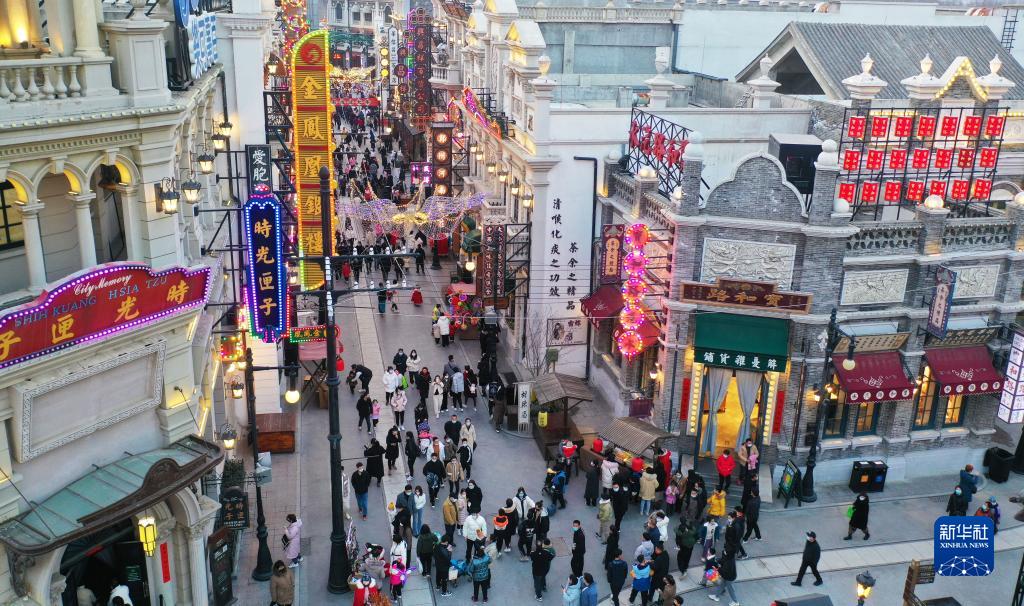 2月5日,游客在河南郑州建业·华谊兄弟电影小镇游览(无人机照片)。