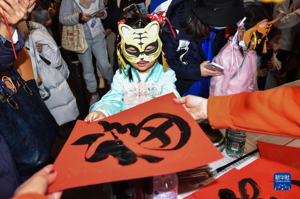2月15日,在清华大学艺术博物馆元宵节夜场活动上,佩戴虎头面具的小朋友领取现场书写的“福”字。