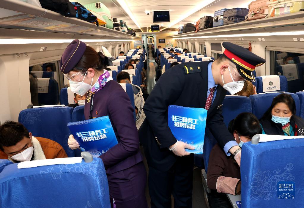 2月12日,列车乘务员在重庆开往上海的G1334次列车上,向春运返程务工人员发放招聘信息。