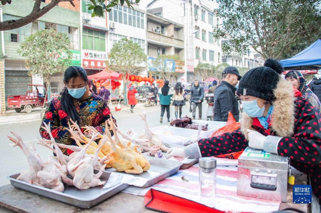 1月29日,在湖北省随县柳林镇主街道上,人们在选购年货。