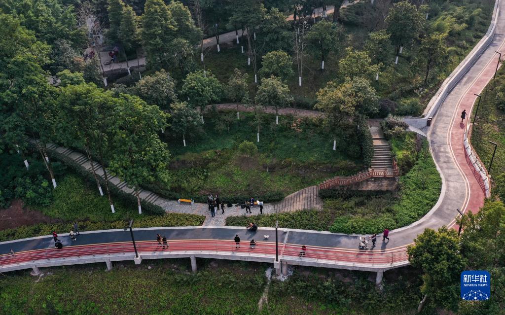 2月15日,游客在位于重庆市大渡口区的重钢崖线山城步道游览(无人机照片)。