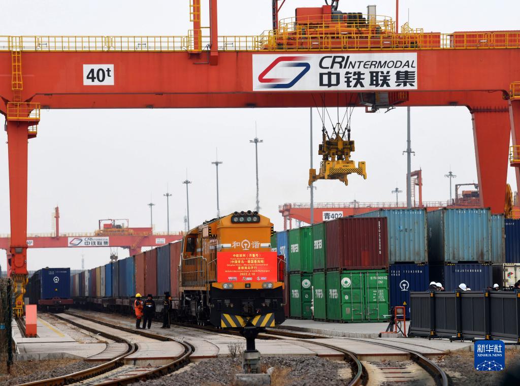 这是2月18日拍摄的中欧班列(齐鲁号)中国青岛—德国曼海姆双向对开首班列车。