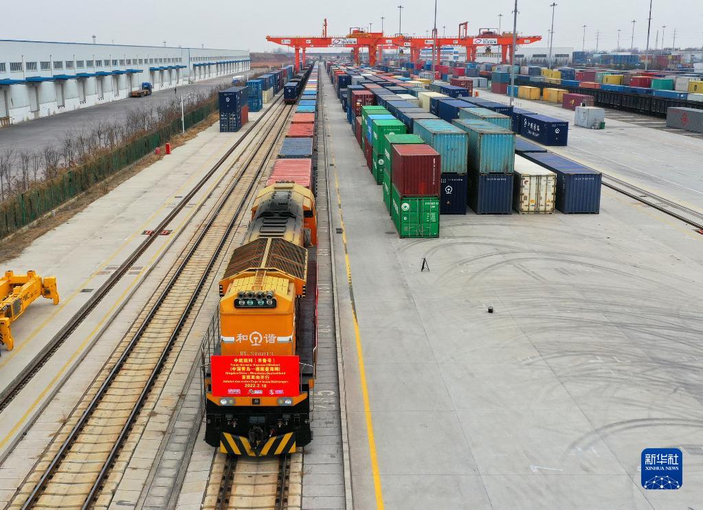 这是2月18日拍摄的中欧班列(齐鲁号)中国青岛—德国曼海姆双向对开首班列车(无人机照片)。