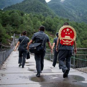 云南省怒江傈僳族自治州贡山县人民法院法官邓兴背着国徽与同事们跨过怒江(2019年8月30日摄)。怒江高山峡谷众多,交通不便,为方便群众、更好地开展法律服务,背着国徽攀高山、过索桥、躲落石、钻老林……成为邓兴法官的工作常态。新华社记者 江文耀 摄