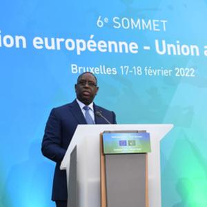2月17日,在比利时布鲁塞尔,非盟轮值主席、塞内加尔总统萨勒在峰会开幕式现场发言。