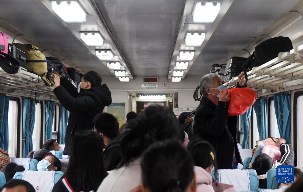 2月19日,旅客在湛江开往南宁的“慢火车”上放行李。