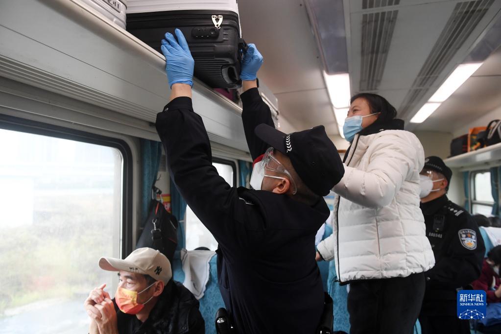 2月18日,在南宁开往湛江的“慢火车”上,南宁铁路公安局南宁公安处乘警帮旅客放行李。