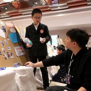 2月19日,一名小朋友向评委介绍他的智能导盲眼镜创意。
