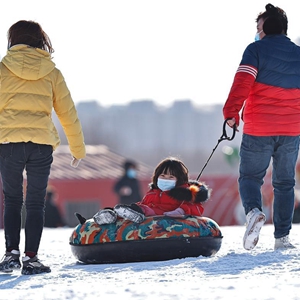 2月19日,在宁夏银川市阅海滑雪场,一名家长带着孩子玩耍。