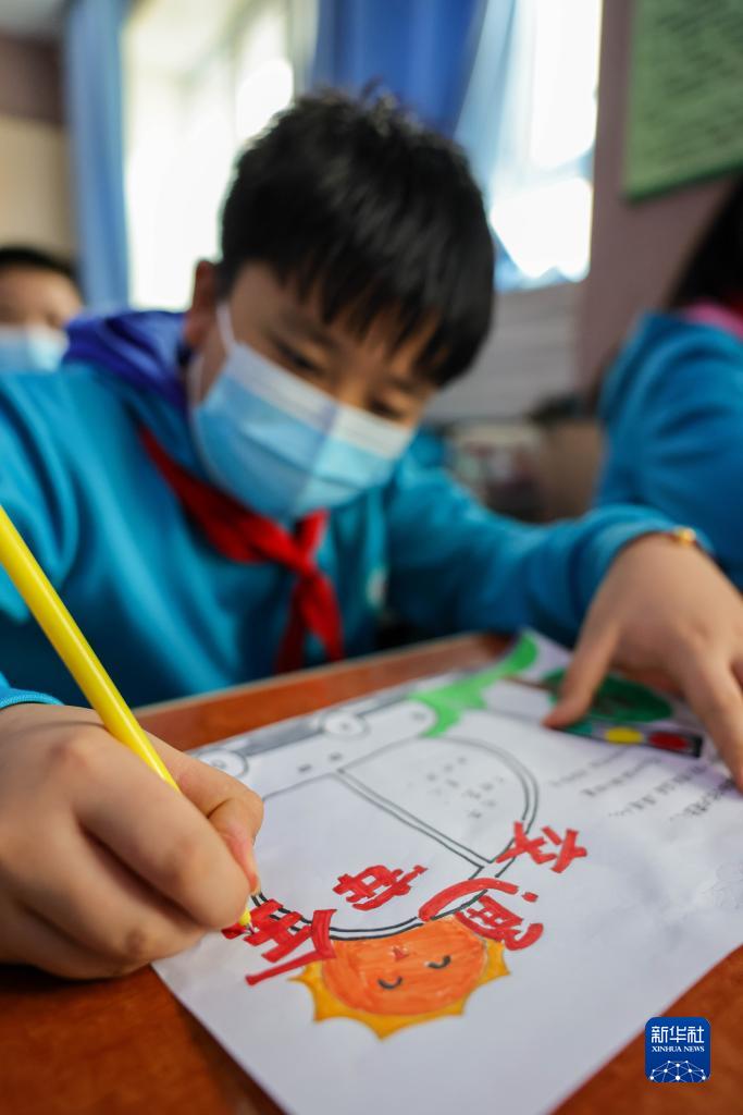 2月20日,乌鲁木齐市第一小学学生在绘制交通安全手抄报。