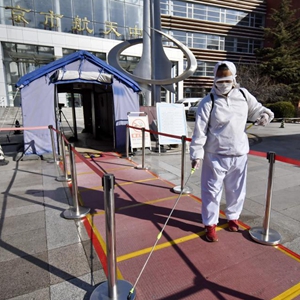 2月20日,在北京市航天中学,防疫人员对教室内的教学设施进行消毒。
