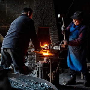 2月20日,在贵州省遵义市凤冈县绥阳镇金鸡社区,一对夫妻在打制传统农具。
