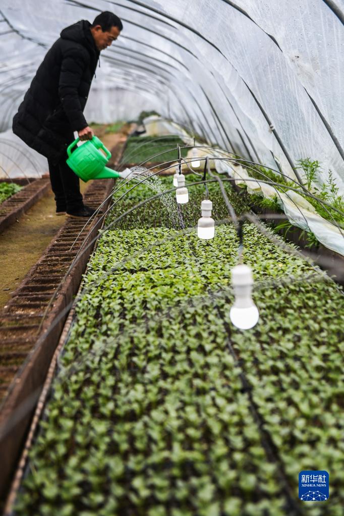 2月22日,种植户在位于织里镇的伟祥生态园育苗大棚里给瓜苗浇水。大棚里通过灯光和加热设备帮助瓜苗生长。