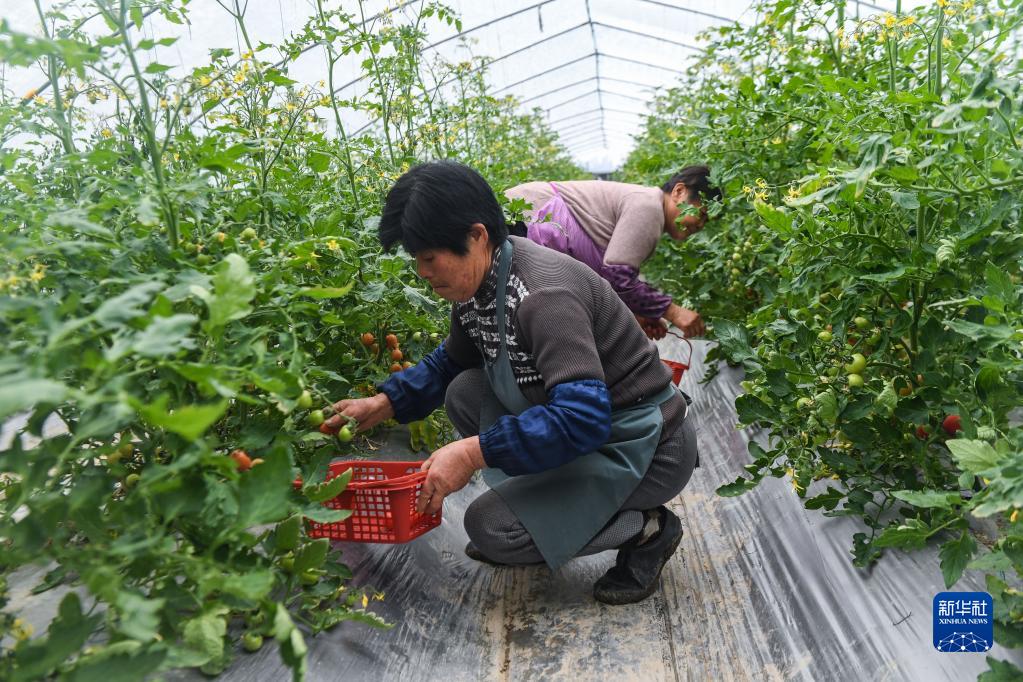 2月22日,种植户在位于织里镇的伟祥生态园大棚里采摘成熟的小番茄。