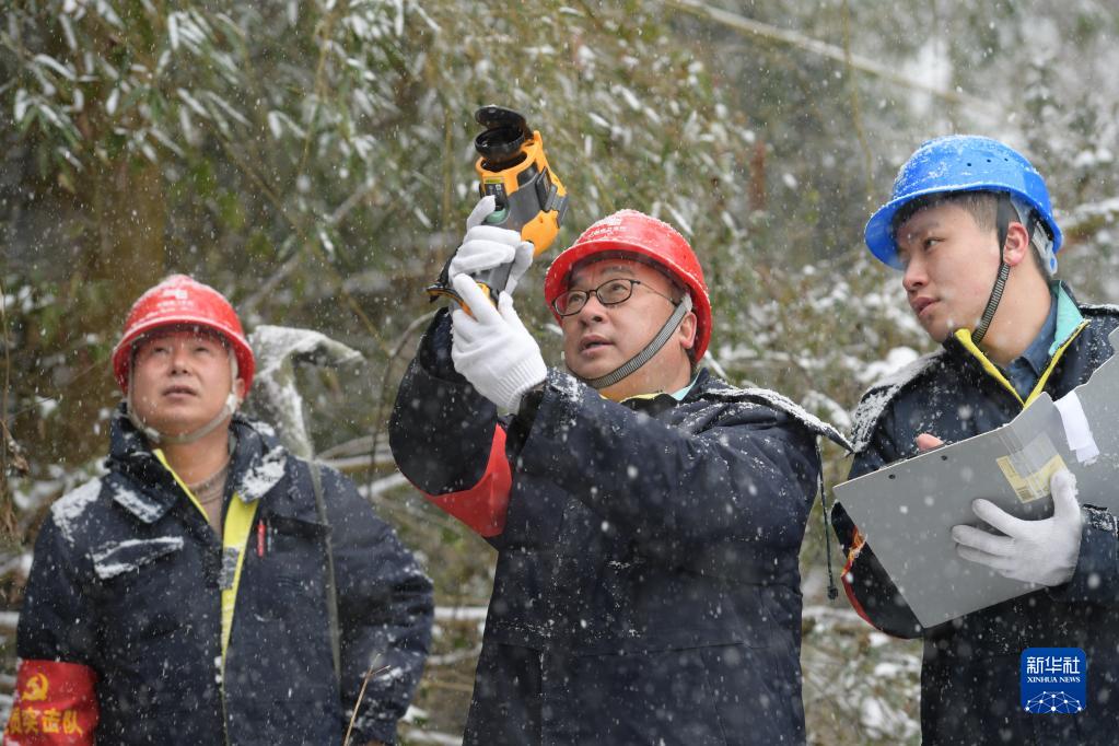 2月22日,南方电网贵州贵阳小河供电局保电突击队的队员利用红外线测温仪对山区跨越线路进行测温,及时掌控高山线路在雪天的运行情况。