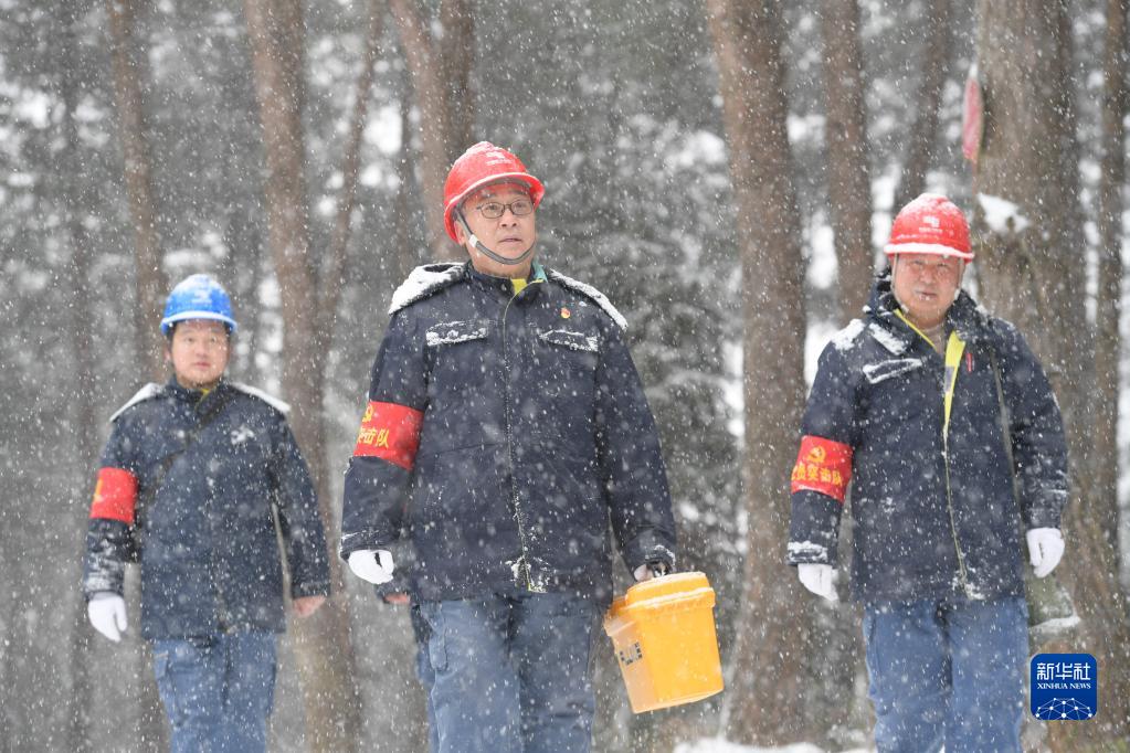 2月22日,南方电网贵州贵阳小河供电局保电突击队的队员冒雪对山区跨越线路进行巡查。