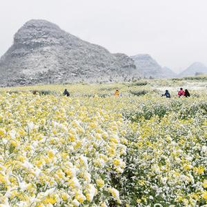 2月22日,在云南省曲靖市罗平县板桥镇金鸡村,游客在雪后的油菜花田中游玩。