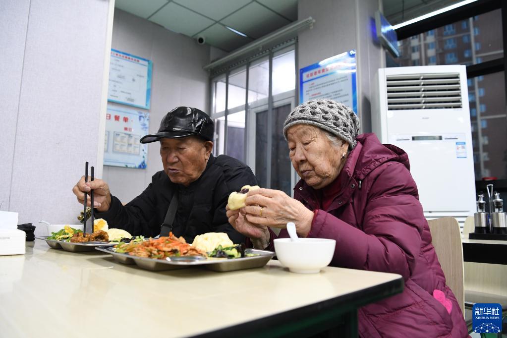 河北省承德市滨河社区老人在社区老年食堂就餐(2021年12月16日摄)。