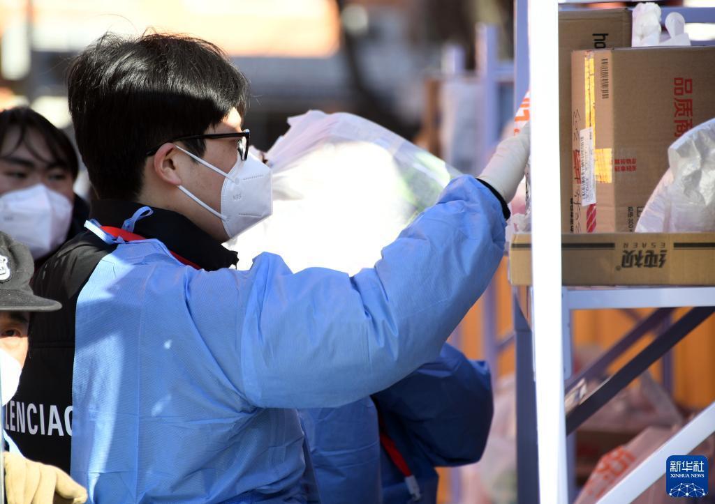 2月23日,工作人员在北京市海淀区北太平庄街道志强北园小区整理快递架上的物品。