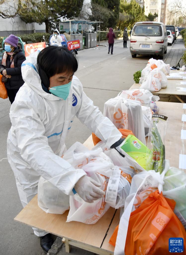2月23日,丰台区东高地街道的社区工作人员在封控区内为居民接收外卖、快递等包裹。