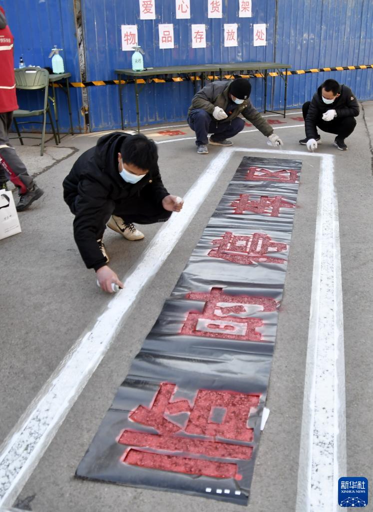 2月23日,丰台区东高地街道的社区工作人员在封控区域外设置标识。