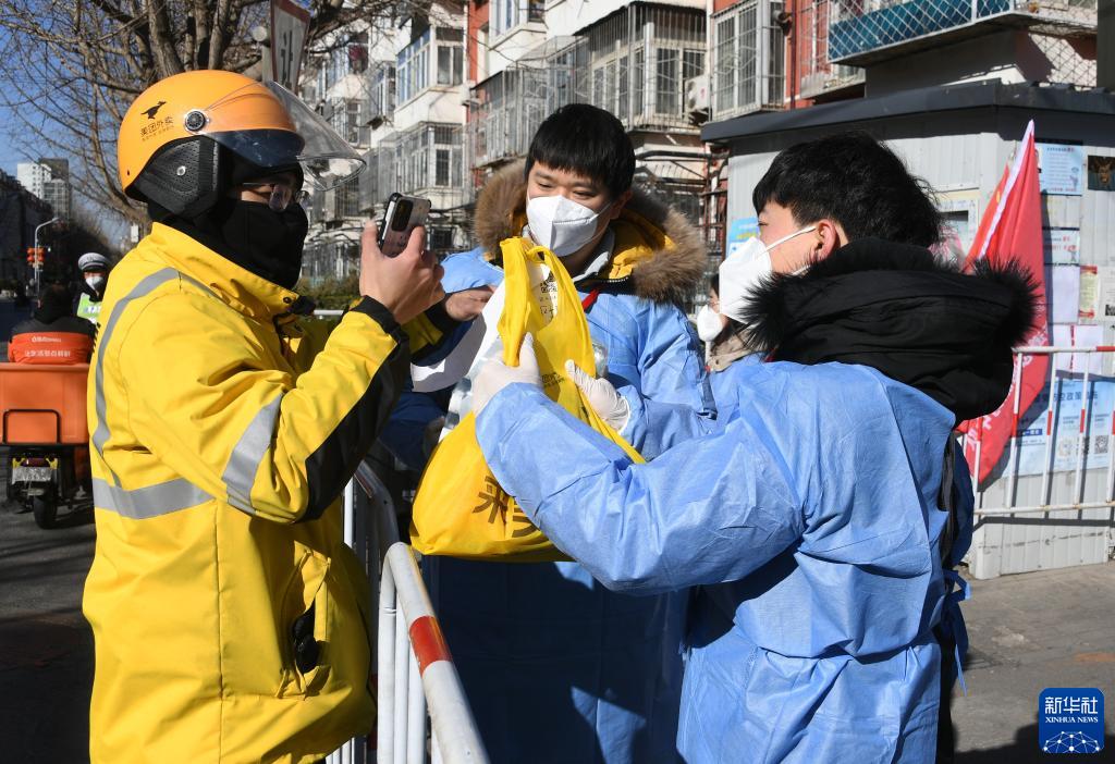2月23日,在北京市海淀区北太平庄街道志强北园小区外,一名配送员将居民订购的物品交给工作人员。
