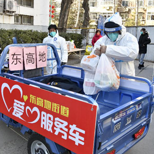 2月23日,在北京市海淀区北太平庄街道志强北园小区,工作人员运送社区居民订购的物品。