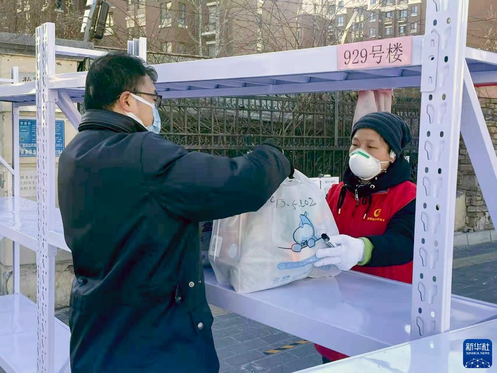 2月23日,在北京市朝阳区来广营乡润泽悦溪小区,工作人员将管控区居民的快递放在专门设置的存货架上,由专人进行分拣(手机照片)。
